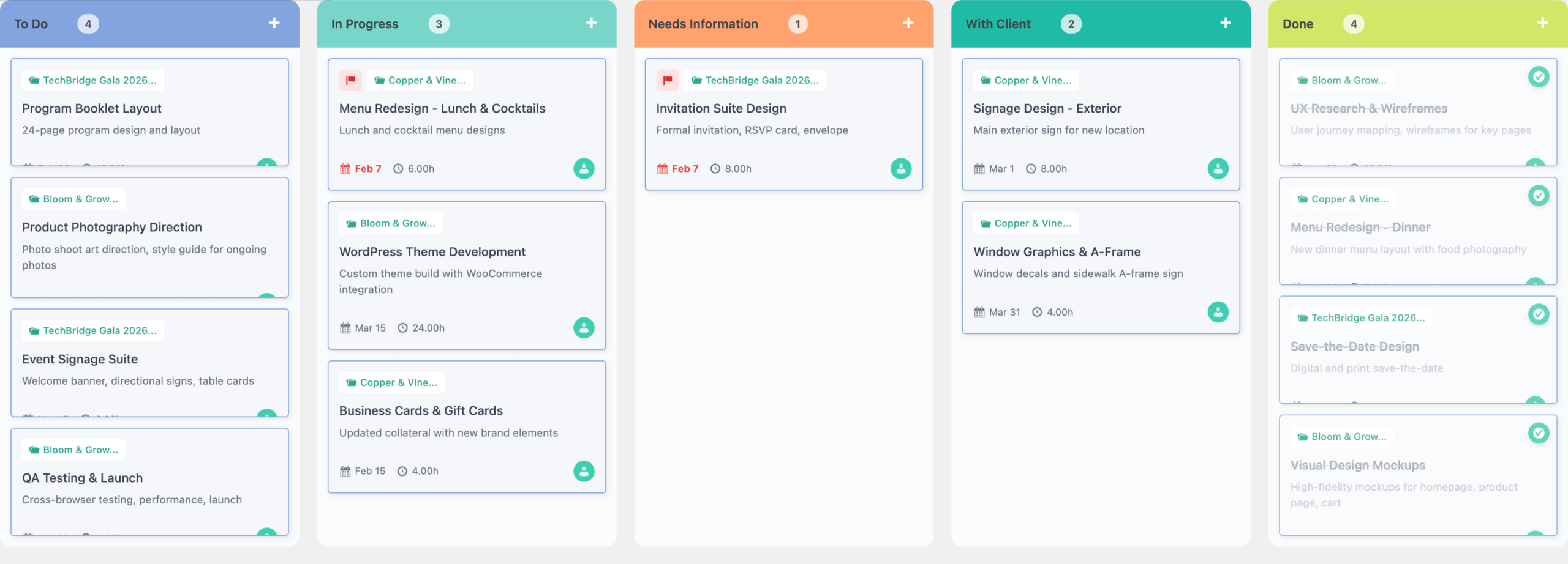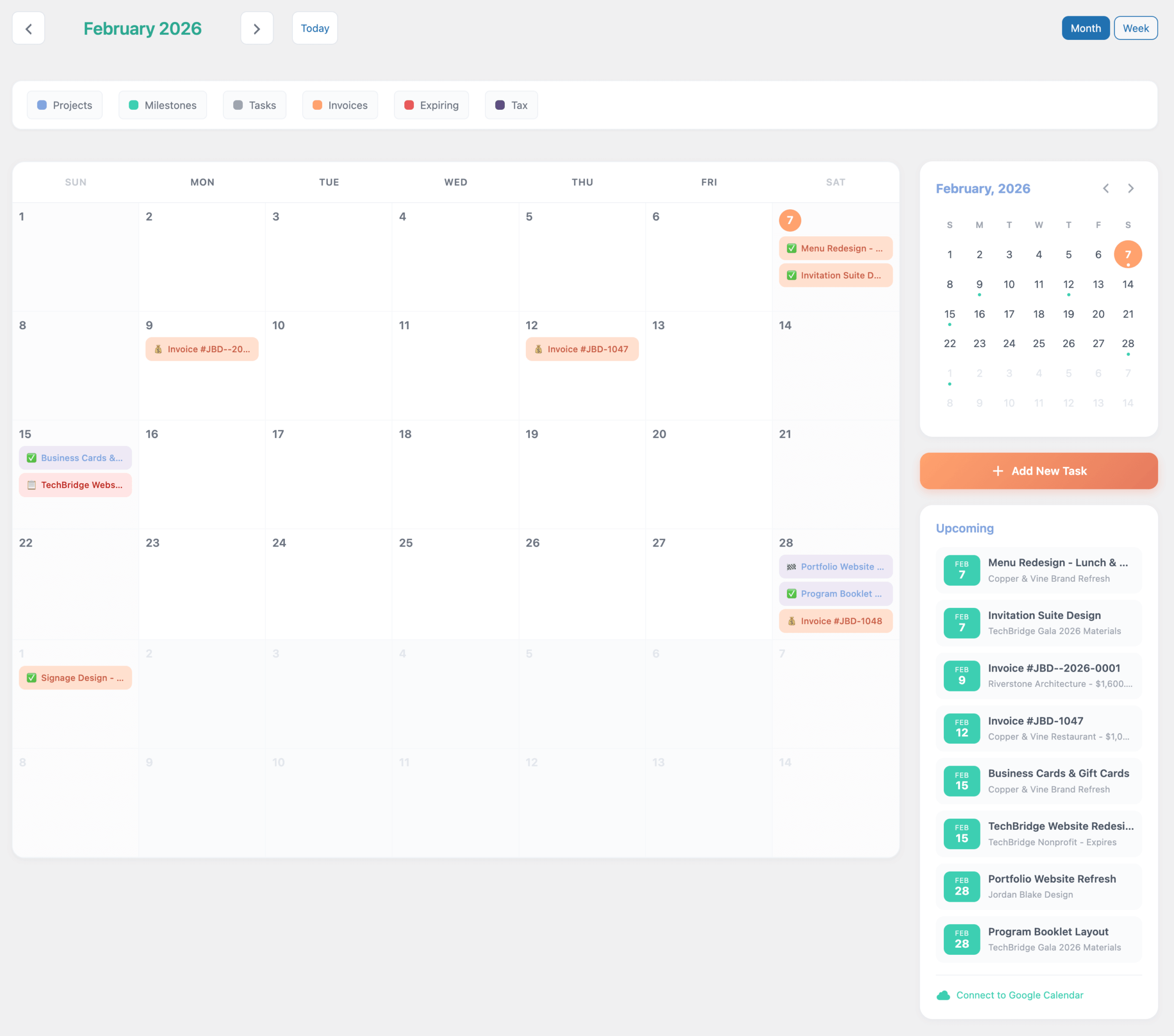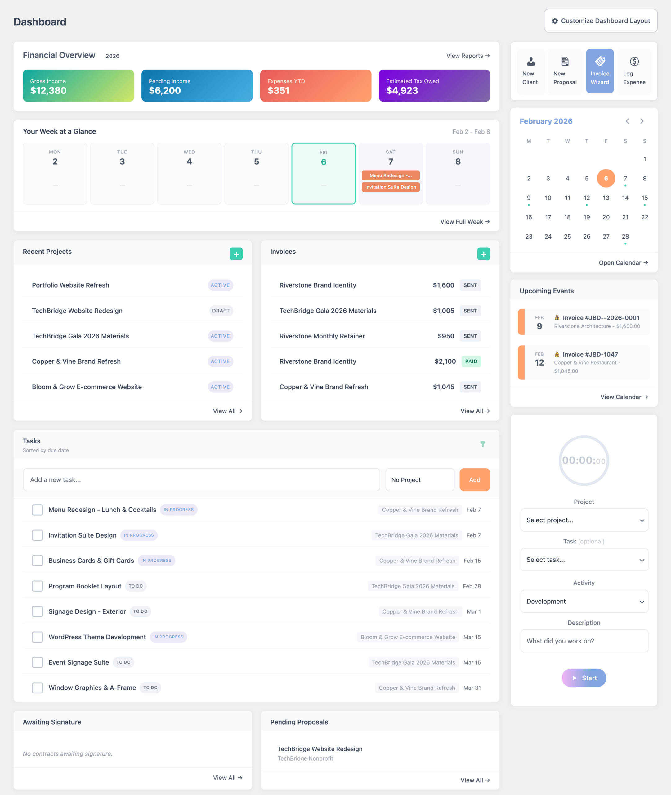 This isn't another generic "small business" tool. It's built specifically for people who do creative work for clients — designers, developers, photographers, copywriters, consultants. People who think in projects, not products.